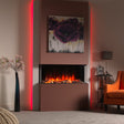 - Actief gloeiend vuurbed van sintels met vijf helderheidsinstellingen en een keuze uit dertien verschillende kleuren die ook instelbaar zijn in continu wisselende cyclus.