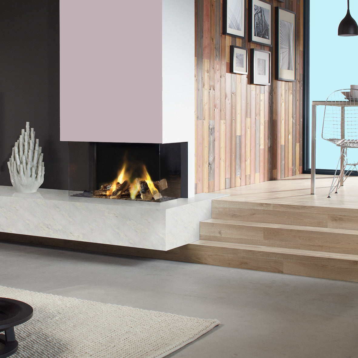 DRU heeft met deze driezijdige gaskachel een strakke haard ontwikkeld die helemaal kan samensmelten met de omgeving. Ze hebben er bij DRU voor gekozen om de kaders zo dicht en strak mogelijk te maken. De mogelijkheid is zelfs aanwezig om een plateau, van natuursteen, helemaal strak tegen de ruit aan te monteren. Hierdoor blijven er helemaal geen randen of kaders in het zicht. Een enorm strakke afwerking dus.