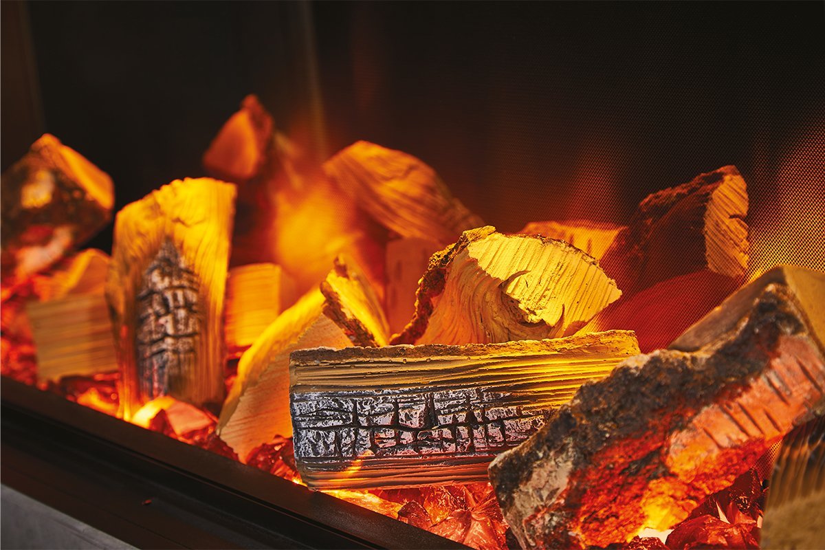 - Actief gloeiend vuurbed van sintels met vijf helderheidsinstellingen en een keuze uit dertien verschillende kleuren die ook instelbaar zijn in continu wisselende cyclus.